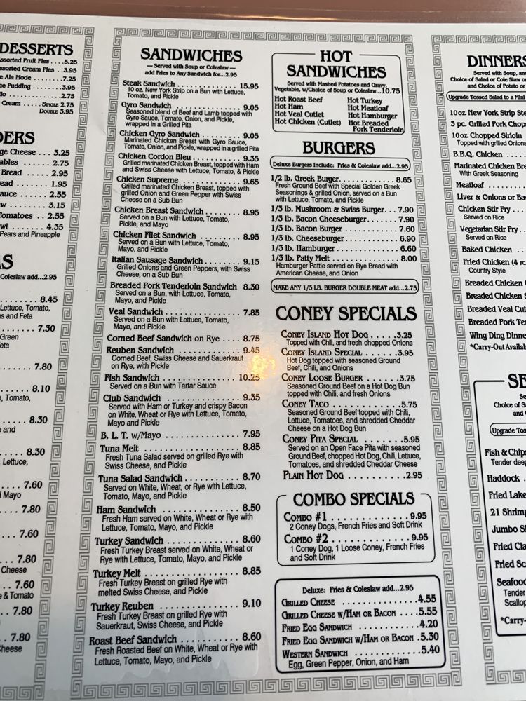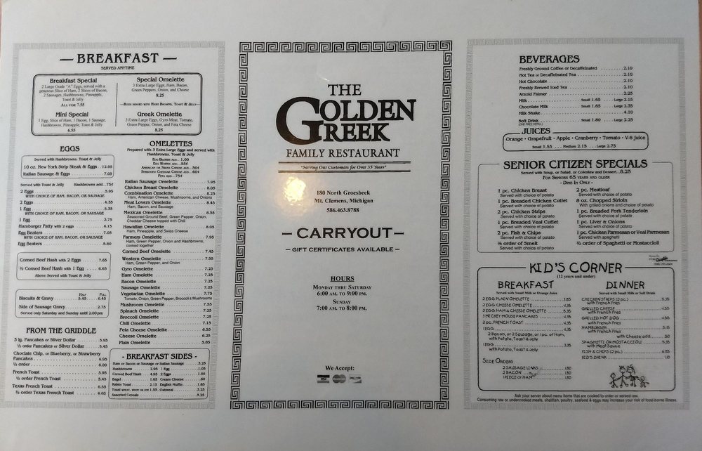 Golden Greek is a cozy diner in Mount Clemens, MI known for its generous portions and friendly service. The menu offers a variety of options for breakfast, brunch, lunch, and dinner, with many vegetarian choices available. Customers rave about the tasty fish and chips, flavorful clam chowder, and hearty rice pilaf. The vintage atmosphere adds to the charm of the place, making it a popular spot for locals and visitors alike. The staff is welcoming and attentive, ensuring a pleasant dining experience. Whether you're craving a traditional Greek dish or a classic American meal, Golden Greek has something for everyone. Don't miss out on their daily specials, and be sure to save room for their delicious desserts. Visit Golden Greek for a satisfying meal in a relaxing setting.